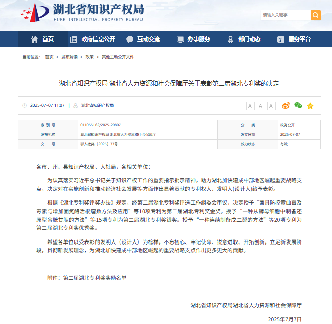 湖北专利奖作为省级知识产权领域的最高荣誉,每5年评选一次,评选标准涵盖技术创新性、产业化效益、法律稳定性及行业影响力,此次获奖是对公司技术创新能力的高度认可。